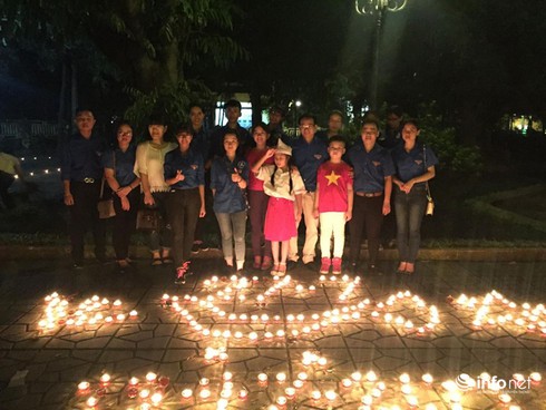 Những ngọn nến được xếp thành hình ảnh bản đồ Việt Nam và các quần đảo thiêng liêng của Tổ quốc, lá cờ sao vàng tổ quốc tung bay phấp phới và cờ đỏ búa liềm. |