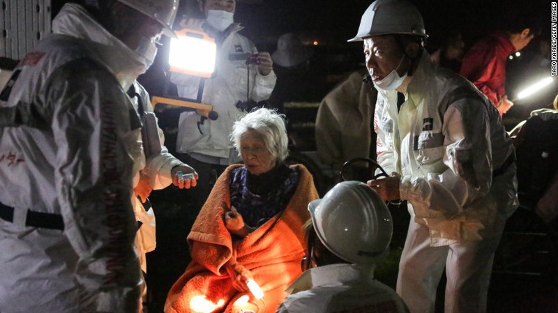 Các nhân viên cứu hộ đang chăm sóc một cụ già bị sốc ở trung tâm sơ tán tại Kumamoto. |