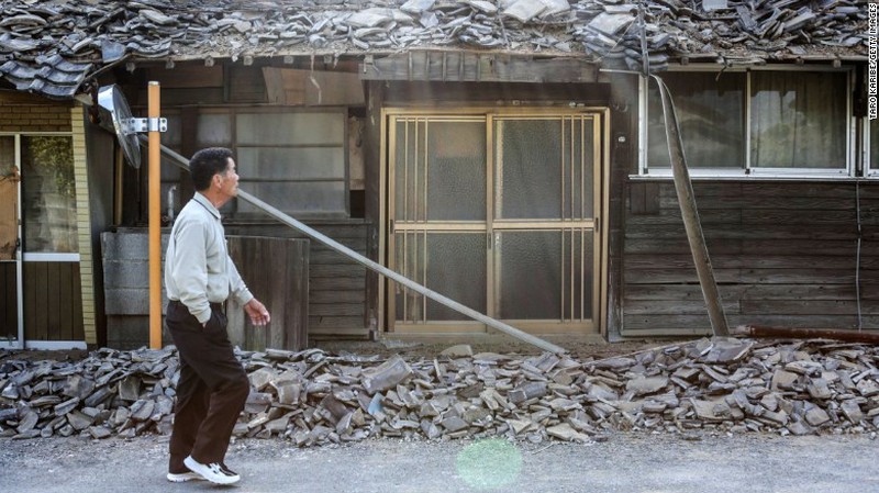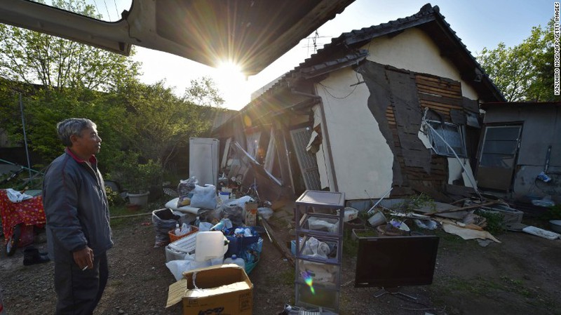 Người đàn ông đang đứng trước ngôi nhà của mình vừa bị động đất phá hủy ở Mashiki. |