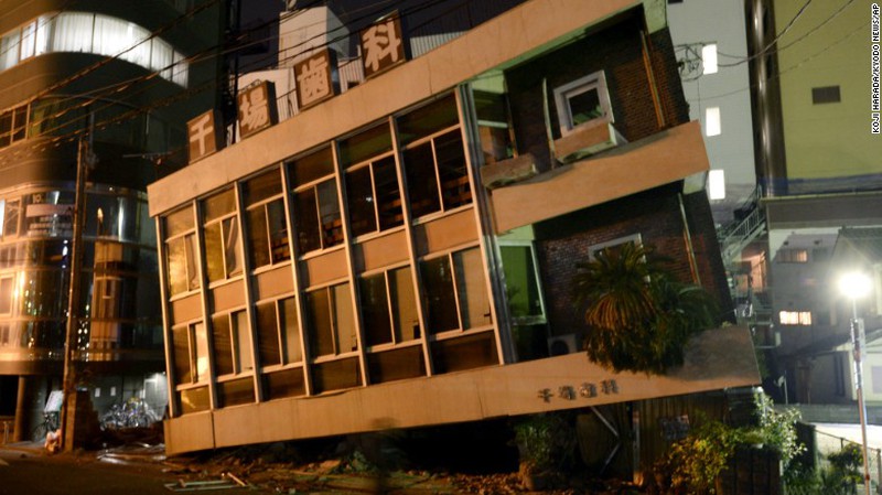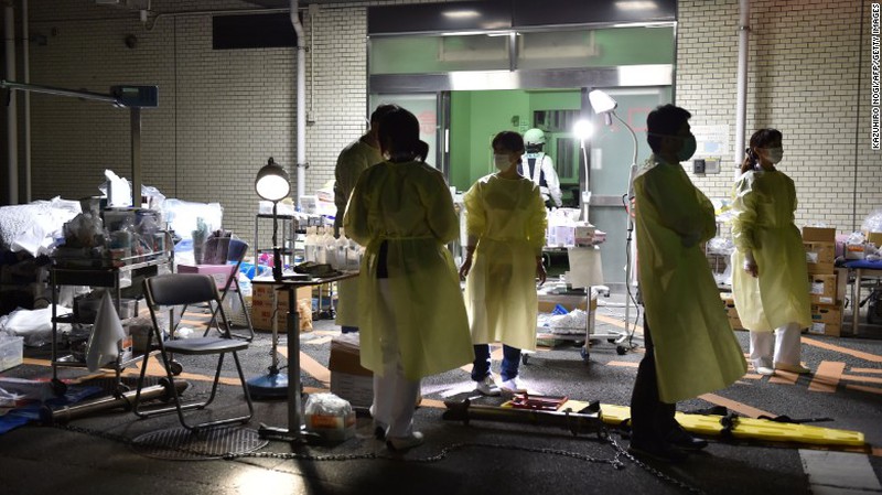 Các nhân viên y tế tại một bệnh viện ở Kumamoto đang chờ chăm sóc các nạn nhân. Khu nhà bệnh viện này cũng có nguy cơ bị sập sau khi hứng chịu trận động đất mạnh. |