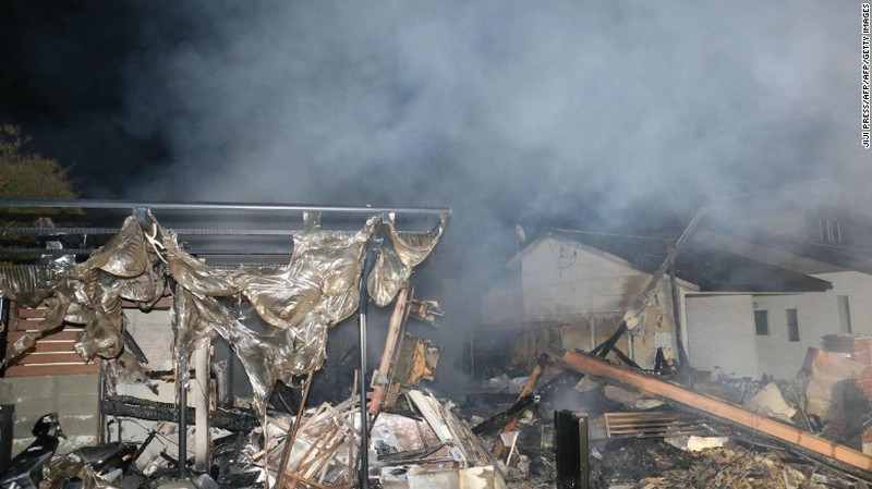 Khói bốc lên từ một ngôi nhà bị cháy sau trận động đất ở Mashiki. |