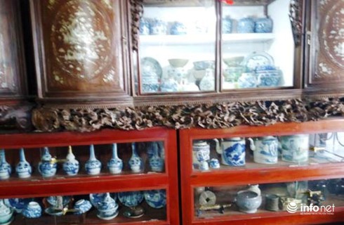 Trong nhà, những bộ tủ chè, tràng kỉ, những chiếc tủ kính trưng bày trên đó vô số đồ sứ, đồ gốm, đồ gỗ, đồ đồng như: Ấm, âu, ang, bát, bình, chân đèn, chân đế, chậu, chén, chum, đĩa, hộp, liễn, lọ, thạp, thống, tước, tượng các loại… Tất cả được xếp thành từng nhóm, từng niên đại khác nhau rất quy củ và khoa học, trông như một bảo tàng tư nhân thực sự.