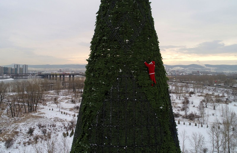 Ông già Noel trang trí cây thông cao 57 mét trong công viên trên đảo Tatyshev, nằm giữa sông Yenisei, thuộc thành phố Krasnoyarsk, Siberia, Nga |
