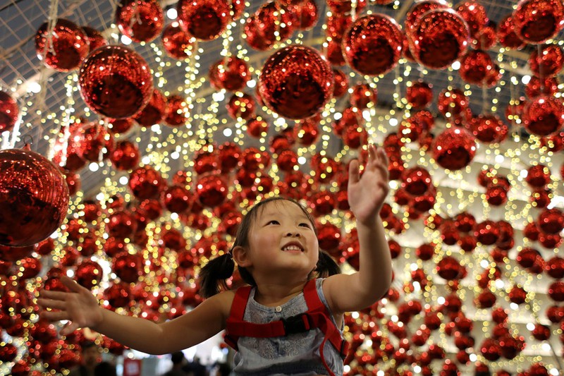 Bé gái nhìn vào đồ trang trí Giáng sinh tại trung tâm mua sắm Emporium ở Bangkok, Thái Lan |