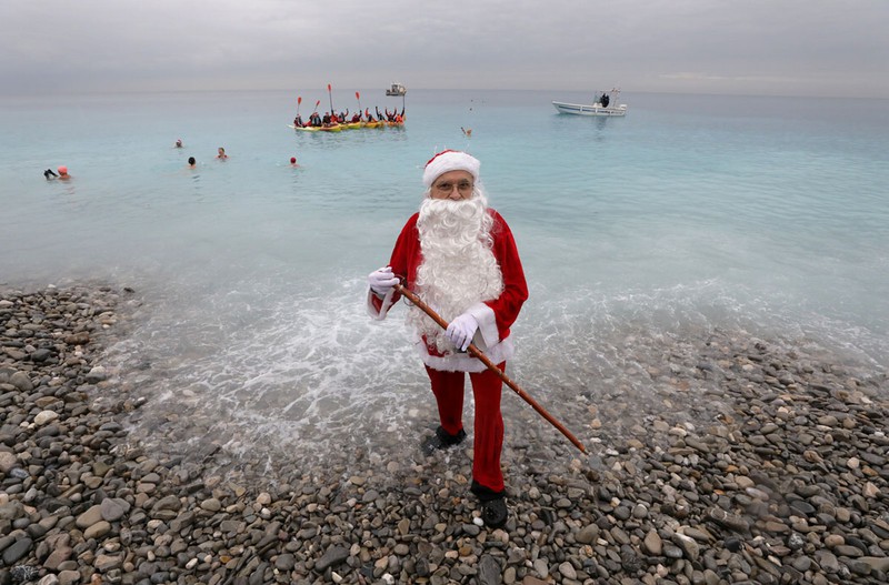 Ông già Noel đứng trên bờ trong buổi bơi mùa Giáng sinh truyền thống ở Nice, Pháp |