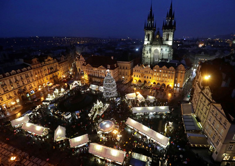 Một cây thông Giáng sinh được chiếu sáng tại chợ Giáng sinh truyền thốn, Quảng trường Phố cổ ở Prague, Cộng hòa Séc |