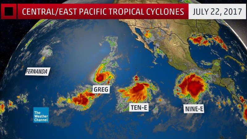 Theo trang thông tin thời tiết Weather.com, ở trung tâm và phía đông Thái Bình Dương vào thứ Bảy (22/7) xuất hiện hai cơn bão có tên là Fernanda và Greg, cùng với hai áp thấp nhiệt đới là Nine E và Ten-E đã mạnh lên thành bão và được gọi tên thứ tự là Hilary và Irwin.