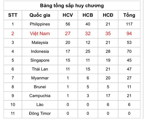 Bảng tổng sắp huy chương SEA Games 30 hôm nay (Cập nhật lúc 19h30 - 4/12). |