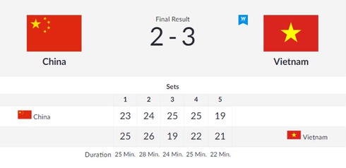 Ở set 5 quyết định, Việt Nam bị dẫn 12-9, 13-10, đứng trước cửa thua nhưng tinh thần bất khuất đã giúp chúng ta gỡ hòa 14-14, và điều đặc biệt xảy ra khi chúng ta giành thắng lợi 21-19. Sau 134 phút thi đấu, tuyển Việt Nam hạ gục "người khổng lồ" Trung Quốc 3-2, giành 2 điểm "quý như Vàng". Được biết, đây là chiến thắng đầu tiên của bóng chuyền Việt Nam trước một đội Trung Quốc ở cấp đội tuyển.