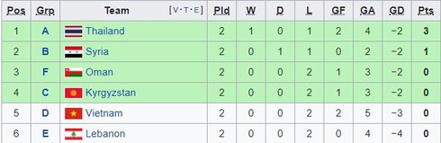 Tính đến thời điểm này, các đội đang xếp thứ 3 tại các bảng đều có cơ hội ngang nhau. Thái Lan đang được đánh giá cao nhất cho một suất đi tiếp khi dẫn đầu nhóm này về mặt thành tích với 3 điểm có được nhưng hiệu số bàn thắng lại đang là -2. Đứng tiếp theo là Syria ở bảng B khi cũng đã có được 1 điểm. Cả 4 đội đứng thứ 3 còn lại là Kyrgyzstan (C), Việt Nam (D), Lebanon (E) và Turmenistan (F) đều chưa có điểm nào.Trong số này, Turmenistan đang có lợi thế hơn đôi chút nhờ hiệu số bàn thắng bại chỉ là -1. Với việc để liền 2 trận mà không ghi được bàn nào, Lebanon đã tụt xuống thứ 6 và nhường vị trí thứ 5 lại cho Việt Nam bởi hiệu số bàn thắng bại kém hơn.