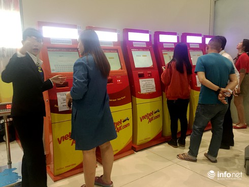 Hành khách làm thủ tục trực tuyến tại các máy đặt tại sân bay để tiết kiệm thời gian. |