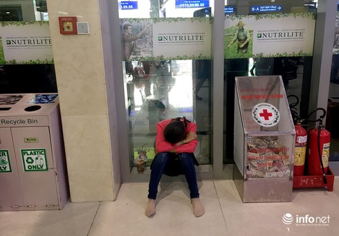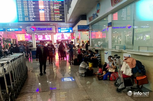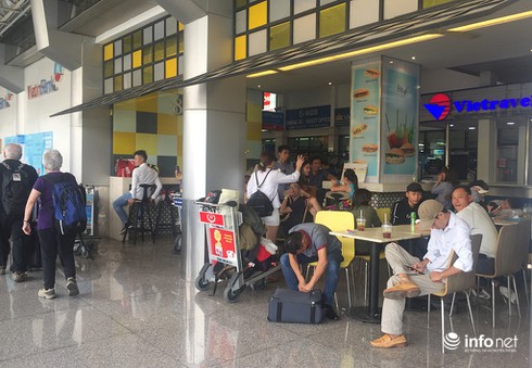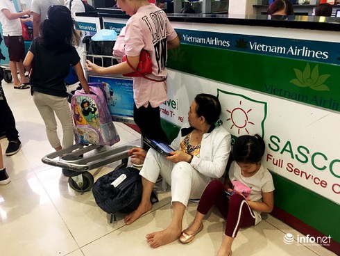 Trong khi đó, khu vực làm thủ tục cho các chuyến bay thường xuyên quá tải, khách xếp hàng dài chờ đến lượt, nhiều người mệt, nằm vật vã tại các ghế chờ sau nhiều giờ ăn bánh mì và nước suối cầm hơi.