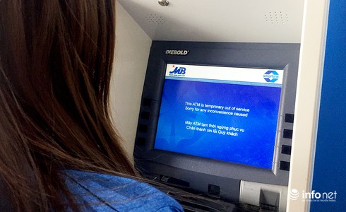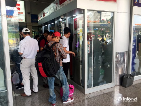Tại vị trí đặt các trụ ATM của các ngân hàng ở ga quốc nội, cảnh tượng xếp hàng chờ đến lượt rút tiền diễn ra thường xuyên. Theo quan sát của PV Infonet, hơn nửa số trụ ATM tại đây bị sự cố, đơn cử như trụ ATM của ngân hàng Eximbank, MBBank, PvcomBank, ShinhanBank… đều hiện cảnh báo, không thể sử dụng được.