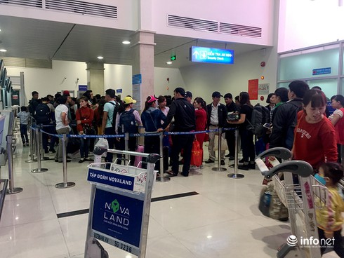 Chiều 11/2 (ngày 26 Tết Mậu Tuất), dòng người mỗi lúc đổ về sân bay Tân Sơn Nhất một đông. Dãy xe ô tô chở hành khách đi máy bay xếp hàng dài, trong khi trong khu vực làm thủ tục nhân viên các hãng hàng không phải làm việc hết công suất.