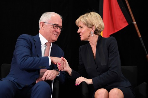 Thủ tướng Australia Malcolm Turnbull (trái) và Ngoại trưởng Julie Bishop bắt tay trong buổi công bố Sách trắng Chính sách ngoại giao ngày 23.11Reuters |