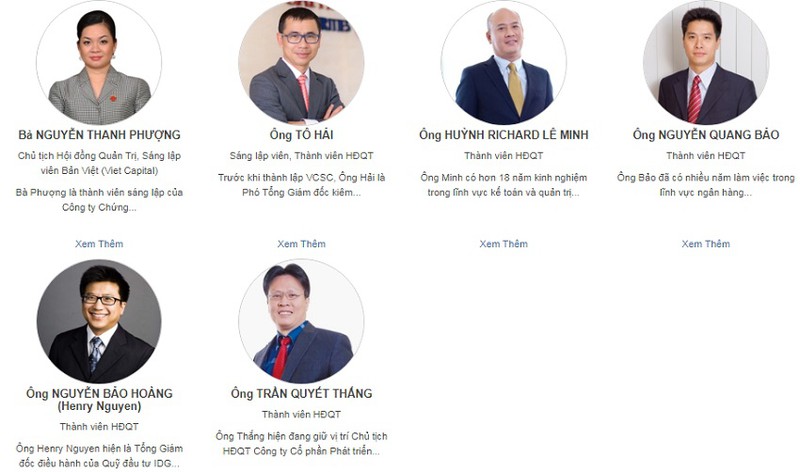 Hội đồng quản trị VCSC có 6 thành viên gồm: bà Nguyễn Thanh Phượng, Chủ tịch HĐQT; ông Nguyễn Bảo Hoàng, thành viên HĐQT; ông Tô Hải, Tổng Giám đốc; ông Huỳnh Richard Lê Minh, thành viên HĐQT; ông Nguyễn Quang Bảo, thành viên HĐQT; và ông Trần Quyết Thắng, thành viên HĐQT.