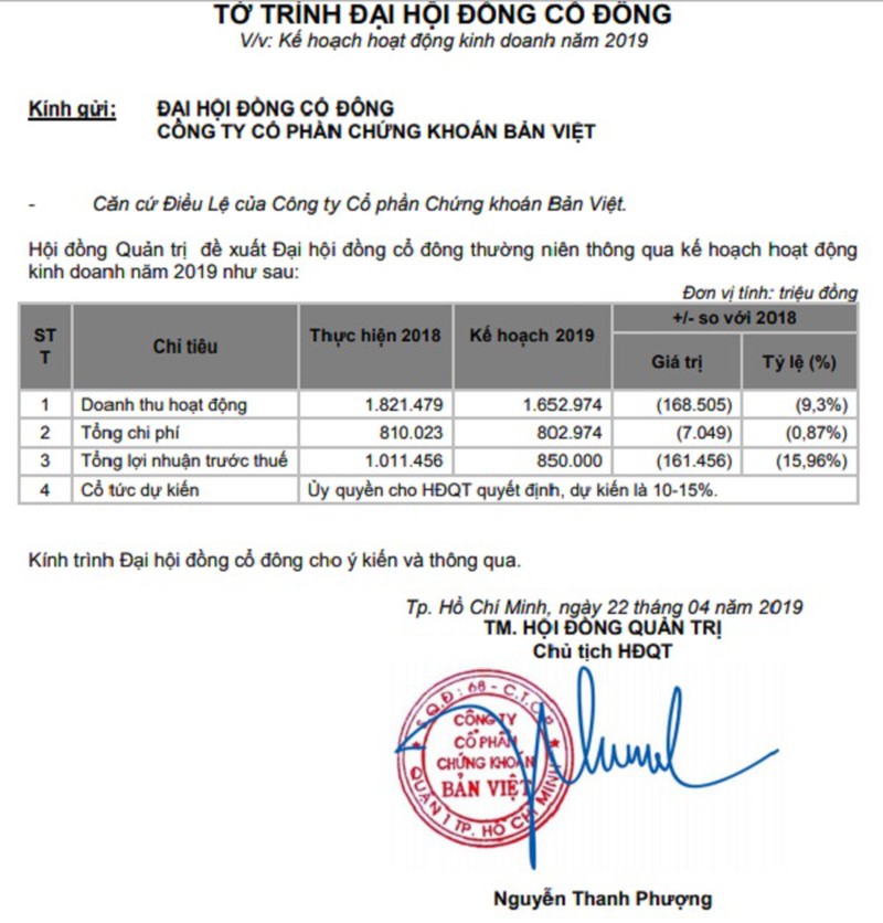 Tờ trình ĐHCĐ về kế hoạch kinh doanh năm 2019 của VCSC. |