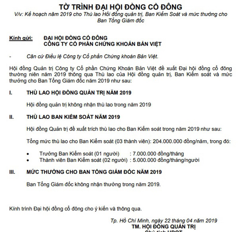 Tuy nhiên, Tờ trình ĐHCĐ không nhắc đến thù lao năm 2019 cho Ban TGĐ. Nhưng dự kiến mức thù lao cho Ban Tổng Giám đốc VCSC mỗi năm cũng xấp xỉ 30 tỷ đồng.