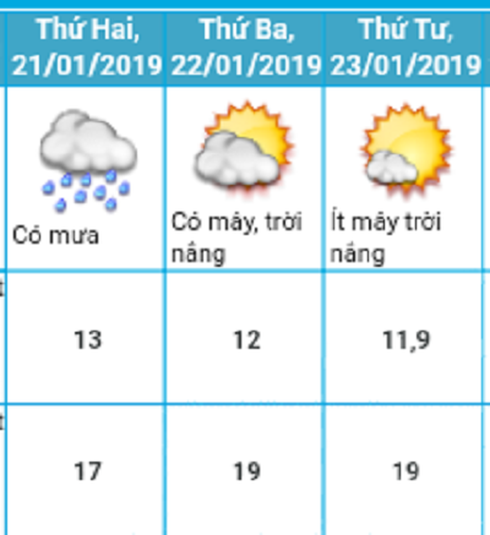 Do ảnh hưởng của không khí lạnh, ở các tỉnh Bắc Bộ trong đêm nay và sáng mai (21/01) có mưa, mưa rào. Từ ngày mai, ở các tỉnh phía Đông Bắc Bộ và Thanh Hóa trời rét đậm, vùng núi rét hại với nhiệt độ thấp nhất phổ biến 12-15 độ, ở vùng núi Bắc Bộ 8-11 độ, vùng núi cao có nơi dưới 8 độ.