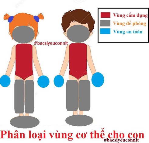 Vùng màu đỏ : là vùng TUYỆT ĐỐI không được đụng tới. Nó là của con và chỉ có con có quyền đụng vào. Ai đụng vào cũng phải xin phép. Bố/mẹ hãy tự dạy con bằng cách "Bin ơi, cho bố/mẹ lau người con nha". Khi lau, chỉ con nhiều lần "Chỗ này con nhớ không cho ai đụng vào nghe con, nếu đụng vào thì Bin la lên và chạy báo cô giáo hoặc chú công an nha". Rồi tự tạo tình huống để vừa chơi vừa dạy con.