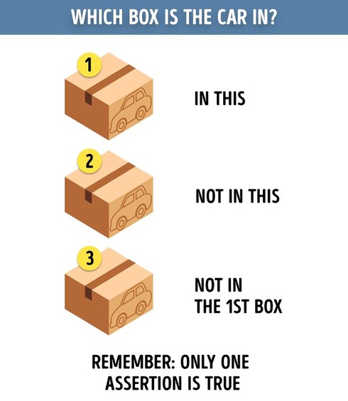 Bạn được cung cấp 3 dữ kiện về 3 chiếc hộp dưới đây. Tuy nhiên, chỉ có 1 dữ kiện chính xác. Nhiệm vụ của bạn là tìm ra chiếc hộp đựng bên trong một chiếc ô tô sao cho chiếc hộp đó thỏa mãn 1 dữ kiện đúng và không thỏa mãn 2 dữ kiện còn lại.