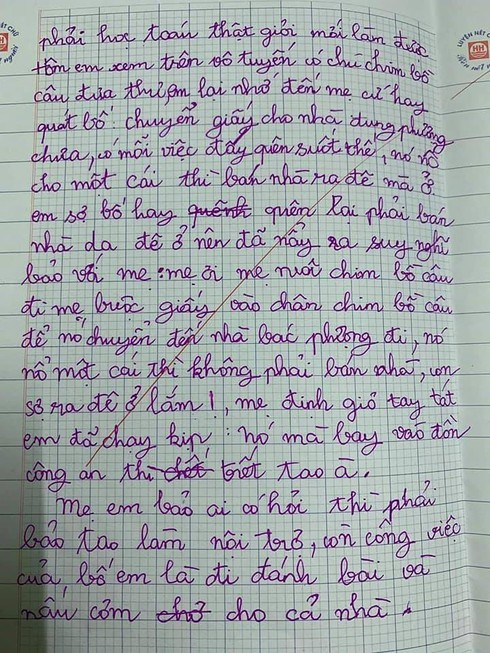 Mẹ bảo phải học toán thật giỏi mới làm được. Hôm em xem trên vô tuyến có chú chim bồ câu đưa thư, em lại nhớ đến mẹ cứ hay quát bố "chuyển giấy cho nhà Dung Phượng chưa, có mỗi việc đấy mà quên suốt thế, nó nổ cho một cái thì bán nhà ra đê mà ở".
