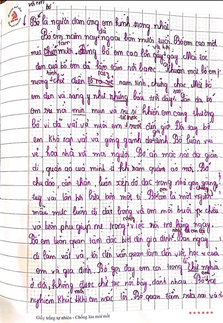 Mới đây, trên mạng xã hội có chia sẻ bài văn tả bố của một cậu bé lớp 5 khiến cộng đồng mạng tấm tắc ngợi khen. Dưới sự quan sát tỉ mỉ của cậu bé, hình ảnh người bố hiện lên vô cùng rõ nét và chân thật từ vóc dáng, gương mặt, làn da… cho đến tính cách và công việc hằng ngày.