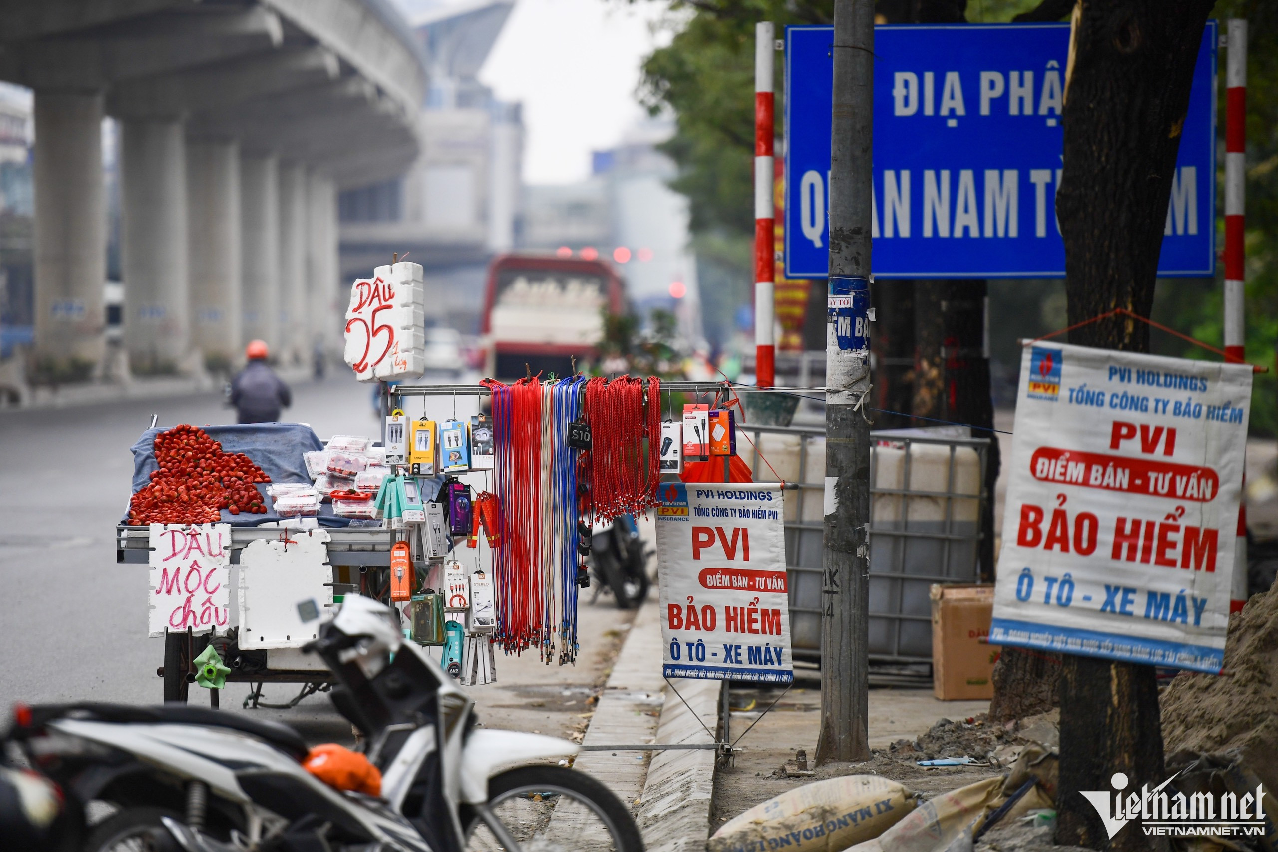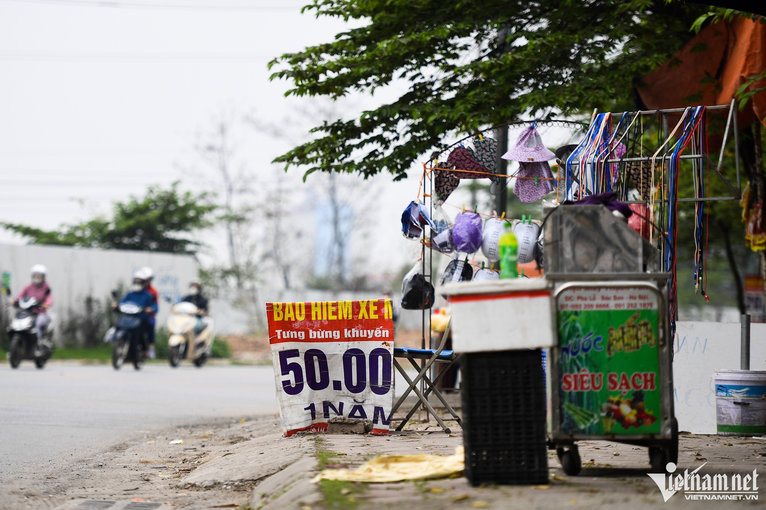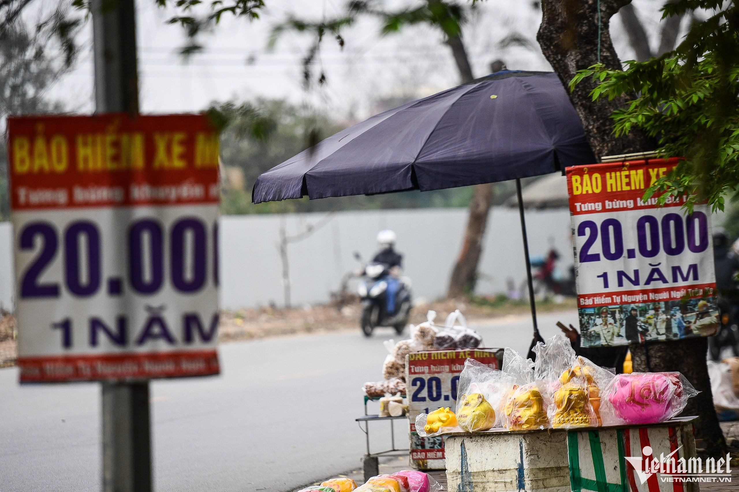 Chỉ cần đặt chiếc bàn, ô che nắng, chủ các quán trà đá hay hàng kinh doanh mũ nón bày bán thêm những tờ bảo hiểm xe máy giá từ 20.000 - 50.000 đồng. Hình ảnh này xuất hiện ở nhiều tuyến phố có bụi cây, bãi cỏ bên rìa trung tâm thủ đô.
