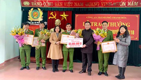 Chiều ngày 2/1, ghi nhận sự xuất sắc của Công an TP Thanh Hóa vì đã thực hiện thành công chuyên án T118 triệt phá ổ nhóm cho vay tín dụng đen núp bóng công ty tài chính, Công an tỉnh Thanh Hóa, Thành ủy, UBND TP Thanh Hóa và Hiệp hội doanh nghiệp tỉnh Thanh Hóa đã trao tổng số tiền thưởng 100 triệu đồng cho đơn vị này.