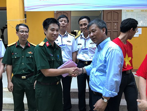 GS.TS. Nguyễn Anh Trí bàn giao danh sách đăng ký hiến máu dự bị cho bệnh xá trên đảo. |