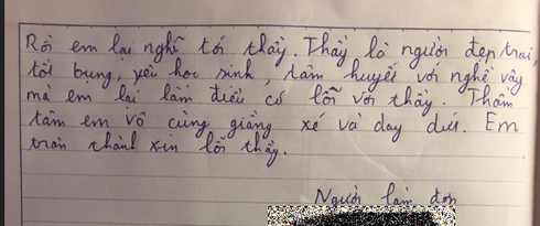 Rồi em lại nghĩ đến thầy, thầy là người tốt bụng, đẹp trai, yêu học sinh, tâm huyết với nghề. Vậy mà em lại làm điều có lỗi với thầy, Trong thâm tâm em vô cũng giằng xé và day đứt. Em chân thành xin lỗi thầy".
