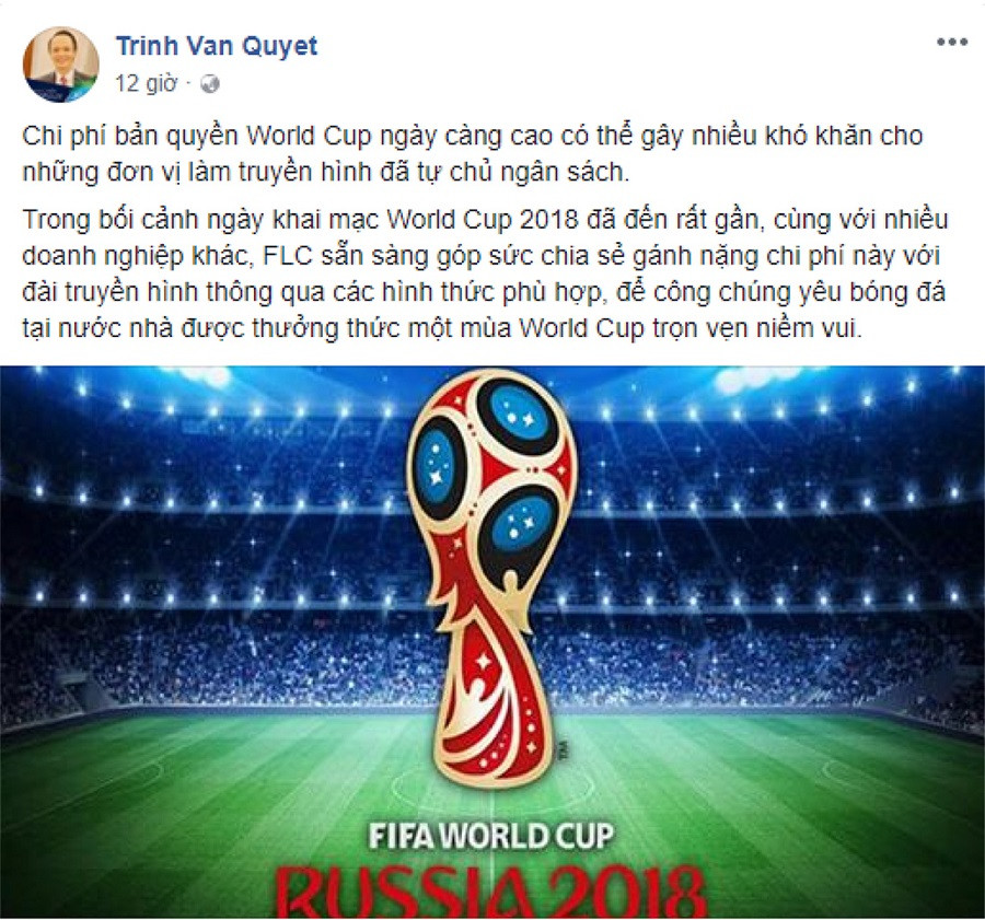 Việc Vingroup tài trợ khi đó cũng xoá tan những đồn đoán về việc Tập đoàn FLC nhận tài trợ mua bản quyền. Thậm chí, ông Trịnh Văn Quyết, Chủ tịch Tập đoàn FLC khi đó còn lên tiếng khẳng định, “FLC sẵn sàng góp sức chia sẻ chi phí này (chi phí bản quyền – PV) với đài truyền hình thông qua các hình thức phù hợp, để công chúng yêu bóng đá tại nước nhà được thưởng thức một mùa World Cup trọn vẹn niềm vui”.