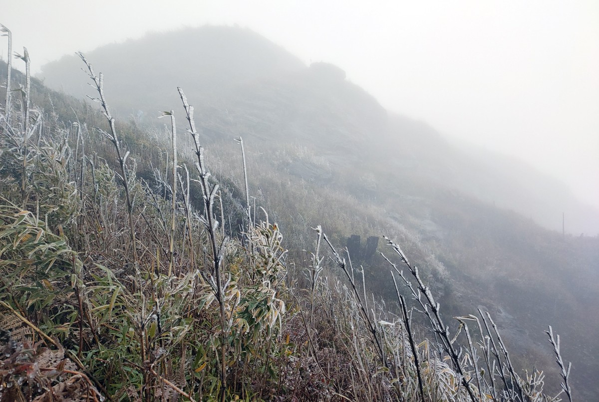 | Từ sáng sớm 20/2, băng giá đã phủ kín đỉnh Lảo Thẩn. |