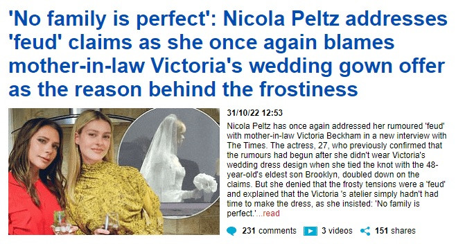 Trong cuộc phỏng vấn, Nicola Peltz hết lời khen ngợi gia đình Brooklyn, vừa khen bố vợ Beckham, vừa miêu ta cô bé Harper là cô bé tuyệt vời nhất. Cộng đồng mạng nói, Nicola Peltz cho rằng gia đình không hoàn hảo, đồng thời khen ngợi bố chồng và em chồng, rõ ràng là nhắm vào Victoria Beckham.