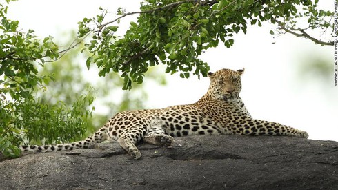 Một con báo nằm trên tảng đá bên trong công viên quốc gia Kruger ở Nam Phi. |