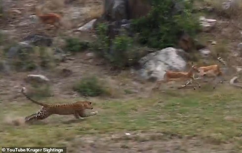 Theo tờ Daily mail, một video ghi lại khoảnh khắc đáng kinh ngạc khi một con báo hoa mai bay người trên không trung đạp một phát trúng ngay linh dương.