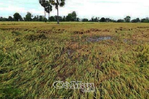Hàng trăm héc-ta lúa ở U Minh, tỉnh Cà Mau bị ngã sập thế này. Ảnh báo Cà Mau |
