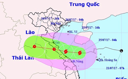 Chiều tối nay (25/7), bão đi vào Hà Tĩnh-Quảng Trị và suy yếu dần thành áp thấp nhiệt đới. Đến 04 giờ ngày 26/7, vị trí tâm áp thấp nhiệt đới ở vào khoảng 17,7 độ Vĩ Bắc; 105,8 độ Kinh Đông, trên khu vực biên giới Việt-Lào. Sức gió mạnh nhất ở vùng gần tâm áp thấp nhiệt đới mạnh cấp 6-7 (40-60km/giờ), giật cấp 8-9.