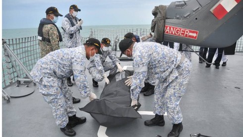 Nhân viên hải quân Malaysia kéo chiếc túi đựng thi thể của một trong số thủy thủ mất tích sau vụ va chạm của tàu khu trụcUSS John S. McCain. |