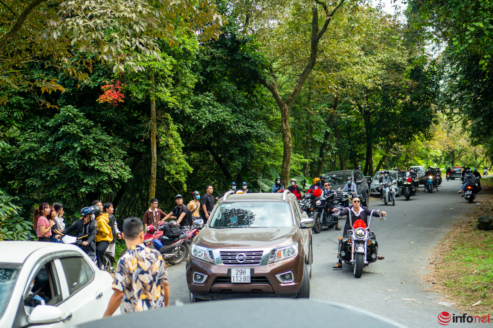 Đường lên vườn quốc gia Ba Vì (Hà Nội) có nhiều khúc cua gấp, thế nhưng khi đến chụp ảnh, nhiều nhóm thanh niên vẫn hồn nhiên túm tụm bên lề đường, không đảm bảo trật tự an toàn giao thông.