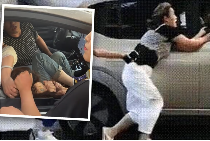 Bất chấp tình thế bấp bênh, người vợ vẫn không buông tóc nhân tình mà la hét kêu cứu khiến người đi đường chú ý đã lao tới chặn đầu xe của người chồng và hỗ trợ người vợ. Phía sau, con gái và con trai của cặp vợ chồng lái một chiếc xe ô tô khác, đuổi theo khi thấy mẹ bị kéo đi.