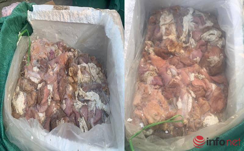 Đoàn kiểm tra đã phát hiện và thu giữ 1. 000kg nầm lợn và 840kg trứng gà non bao bì có in chữ nước ngoài nhưng không có hoá đơn chứng từ, không được kiểm định chất lượng đang trong tình trạng phân huỷ, bốc mùi hôi thối.