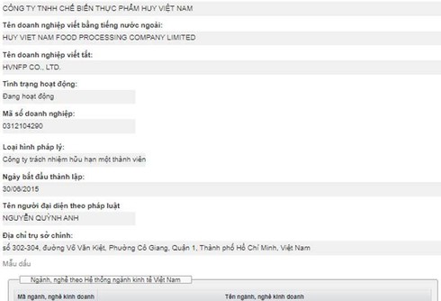 Cũng theo Cổng thông tin quốc gia về đăng ký doanh nghiệp, Công ty TNHH chế biến thực phẩm Huy Việt Nam được thành lập vào tháng 6/2015, có trụ sở tại số 302-304, đường Võ Văn Kiệt, Phường Cô Giang, Quận 1, TPHCM.