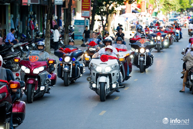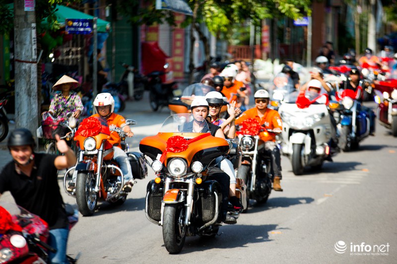 Cuối tuần vừa qua, người dân thành phố Phủ Lý (tỉnh Hà Nam) đã không khỏi bất ngờ khi chứng kiến đám cưới được đón dâu bằng dàn xe mô tô khủng.