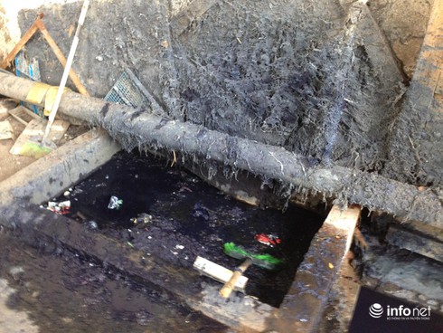 Dòng nước đen đặc với một mảng bọt dày đóng bám trên bề mặt nước. |