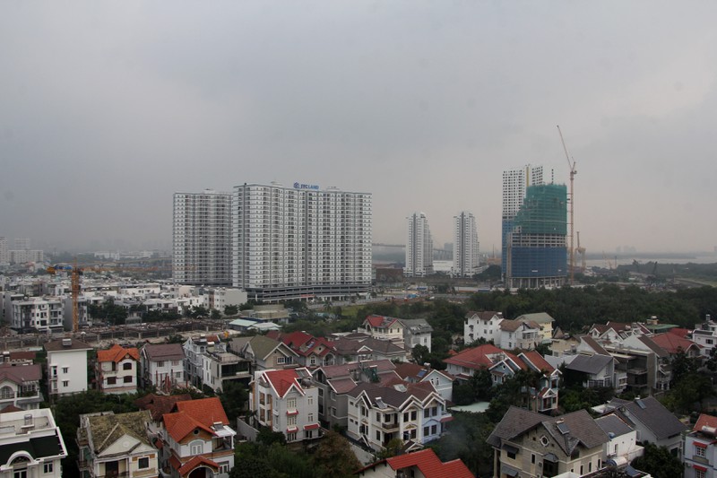 Lớp "sương mù" bao phủ cả những khu vực ngoại thành, có ít nhà cao tầng. |