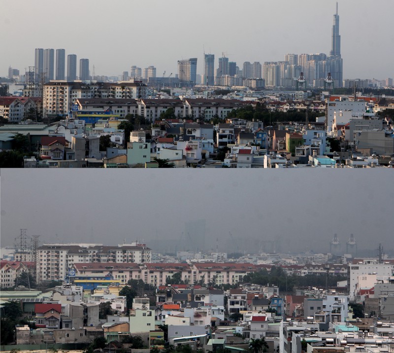 Bức ảnh so sánh cùng một vị trí tại hai thời điểm chụp. Vào ngày 21/9 khối cao ốc phía sau đã "biết mất" do lớp mù dày đặc (ảnh dưới). |