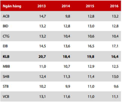 Năm 2016, tỷ lệ an toàn vốn (CAR) của KLB là 16,35%, giảm so với các năm liền trước . Tuy nhiên tỷ lệ này vẫn cao hơn đáng kể so với quy định tối thiểu 9% của Ngân hàng Nhà nước, và ở mức cao nhất nếu so sánh với CAR của các ngân hàng đang niêm yết. Hệ số an toàn vốn chủ yếu được đảm bảo bằng nguồn vốn cấp 1 và chưa sử dụng đến nguồn vốn cấp 2. Do vậy, trong trường hợp tỷ lệ an toàn vốn của các ngân hàng phải áp dụng quy định chặt chẽ hơn (theo Thông tư 41), KLB vẫn còn dư địa cho việc nâng cao hệ số an toàn vốn, thông qua việc tăng vốn cấp 2 như phát hành trái phiếu dài hạn.