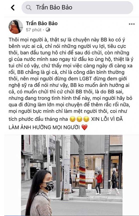 "BB chẳng là gì cả, chỉ là công dân bình thường thôi nên mọi người đừng đem LGBT, đừng đem giới nghệ sĩ ra để nói như vậy, BB không muốn ảnh hưởng đến ai cả. Có muốn chửi thì chửi BB thôi, là do BB sai.