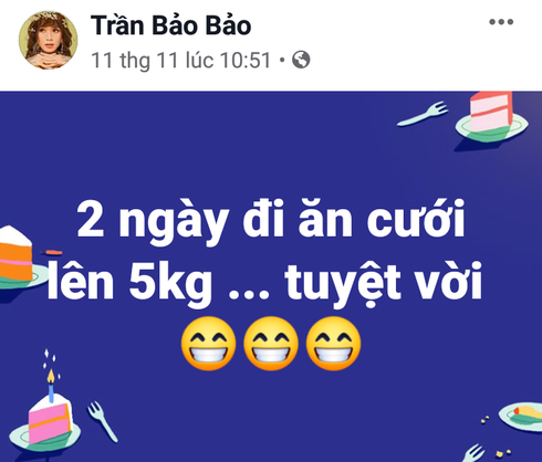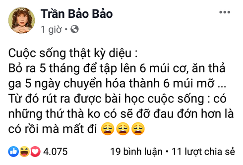 Trên trang cá nhân, BB Trần vừa thông báo body 6 múi đã tiêu tan sau 5 ngày ăn uống thả ga. Anh chàng hài hước chia sẻ: "Cuộc sống thật kỳ diệu: Bỏ ra 5 tháng để tập lên 6 múi cơ, ăn thả ga 5 ngày chuyển hóa thành 6 múi mỡ ...Từ đó rút ra được bài học cuộc sống: có những thứ thà không có sẽ đỡ đau đớn hơn là có rồi mà mất đi".